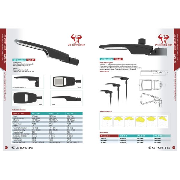 Outdoor LED Street Lights, produced by Die-casting Man with the model number YASL, has an excellent performance in various outdoor lighting applications. With its IP65 waterproof rating and AC85-265V input voltage, the LED street lights can be used in any outdoor environment. The luminous flux of the LED street lights can reach up to 3000-18000lm, and the lifespan of the product is up to 50,000 hours. In addition, the 3-5 year warranty from Die-casting Man guarantees the quality of the product. Thanks to its public lamp led, price led street lights, and led light housing outdoor lighting features, these LED street lights are perfect for all types of outdoor lighting needs.